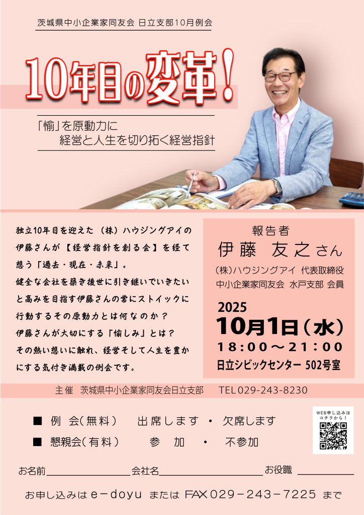 独立10年目を迎えた(株)ハウジングアイの伊藤さんが【経営指針を創る会】を経て想う「過去・現在・未来」。健全な会社を築き攻勢に引き継いでいきたいと高みを目指す伊藤さんの常にストイックに行動するその原動力とは何なのか?伊藤さんが大切にする「愉しみ」とは?その熱い想いに触れ、経営そして人生を豊かにする気付き満載の例会です。