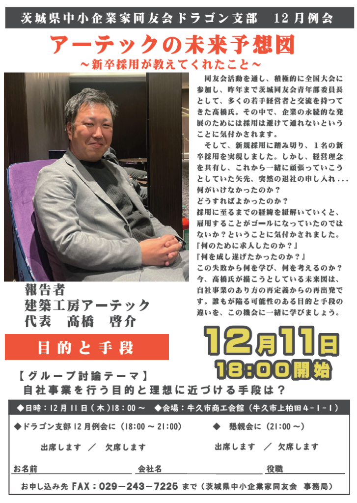 同友会活動を通し、積極的に全国大会に参加し、去年まで茨城同友会青年部委員長として、多くの若手経営者と交流をもってきた高橋氏。その中で、企業の永続的な発展のためには採用は避けて通れないということに気づかされます。