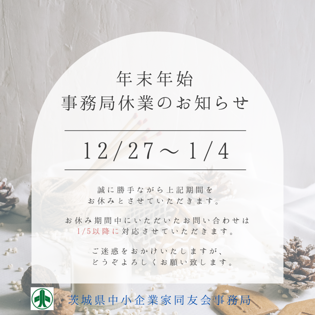 2025年12月27日(土)~2026年1月4日(日)までは茨城同友会事務局は冬季休業とさせていただきます。