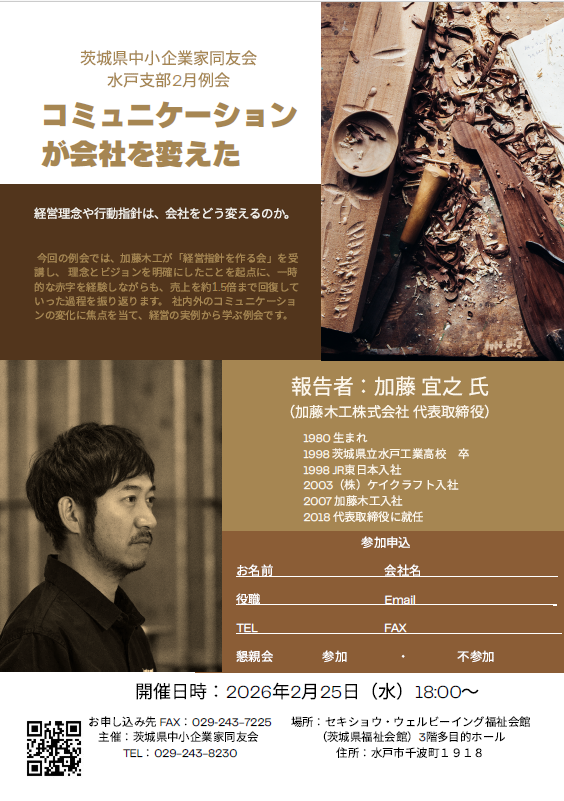 今回の例会では、加藤木工が「経営指針を創る会」を受講し、理念とビジョンを明確にしたことを起点に、一時的な赤字を経験しながらも、売上を約1.5倍まで回復していった過程を振り返ります。